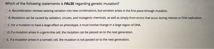 Which of the following statements is false. Which of the following statements about mutations is false. Mutations typically occur during the production or repair of DNA mutations involve changes in DNA sequence mutations in somatic cells of multicellular organisms are passed to offspring through sexual reproduction mutations may be due to mistakes in normal biological processes such as.