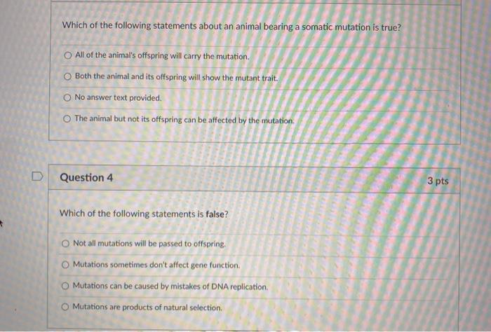 You can answer 3 questions per day here - each question you answer correctly will reward you with a small prize. Somatic mutations can not be inherit in offspring of mutated individuals. Looking at the given options the one that is false is option A because generally speaking for a population whereby a trait is being exposed to stabilization of selection over time the mean will certainly remain approximately the same.